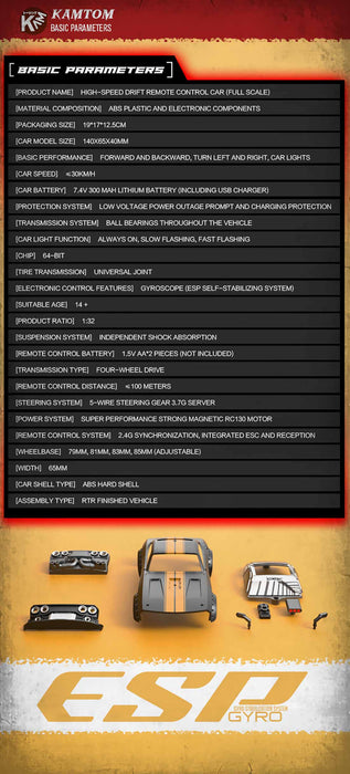 1/32 Scale 2.4G 4WD RC Drift Car with LED Headlights (Black/Red) Product Information: Unleash the thrill of drifting with this high-precision 1:32 scale RC drift car! Equipped with advanced 32-bit processing and ESP gyroscope technology, this 4WD electric car delivers seamless control and stability. With three LED head