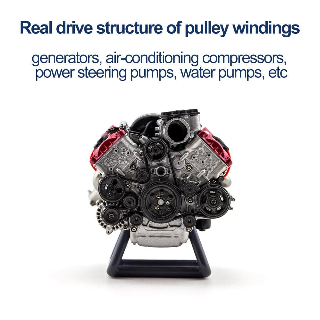 Simulated V8 Engine Operation: The model mimics the structure and moving parts of a real V8 engine, including a full belt-driven accessory system (alternator, AC compressor, steering pump, etc.).